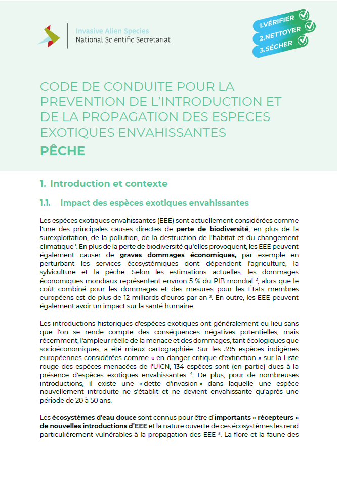 Les mesures listées font partie d’un code de conduite, élaboré en collaboration avec des organisations et fédérations du secteur de la pêche en Belgique (Wallonie, Flandre, et Bruxelles). Le développement de ce code est fait dans le cadre du chapitre sur les eaux douces du plan d'action national sur les voies prioritaires d'introduction et de propagation non intentionnelles dEEE de la liste de l’Union en Belgique.