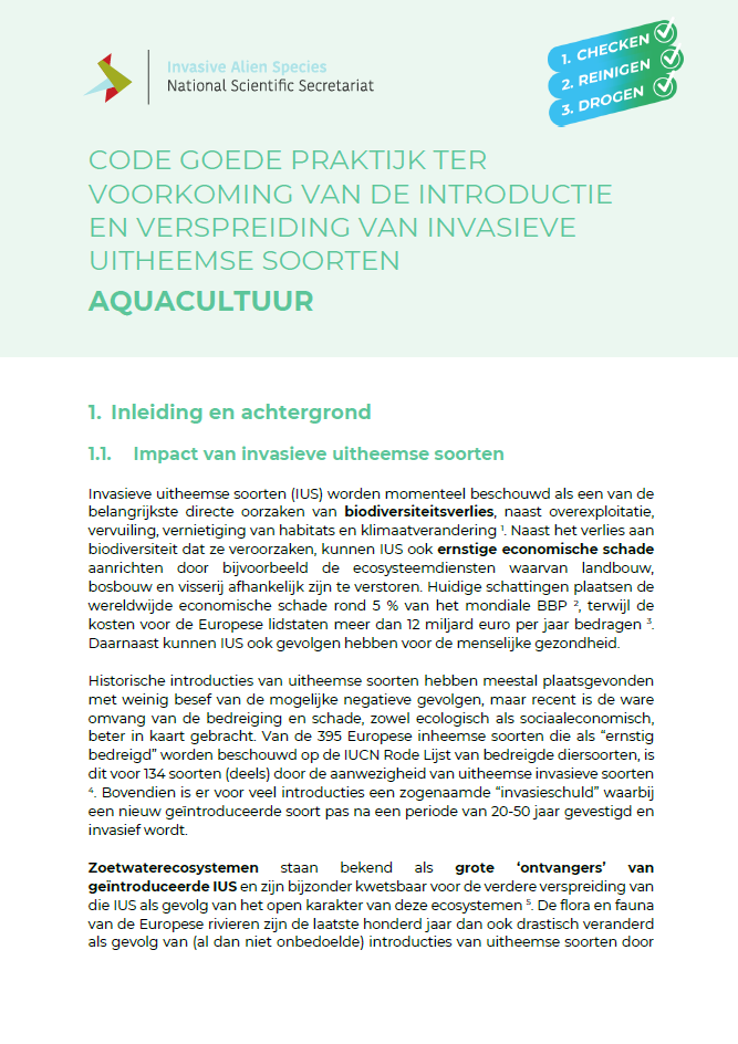 Deze maatregelen maken deel uit van een code goede praktijk die is opgesteld in samenwerking met organisaties en federaties van de aquacultuur sector in België (Vlaanderen, Brussel en Wallonië). Deze code is ontwikkeld in het kader van het hoofdstuk betreffende zoet water van het nationaal actieplan voor de aanpak van de onopzettelijke introductie en verspreiding van invasieve uitheemse soorten van de Unielijst in België.